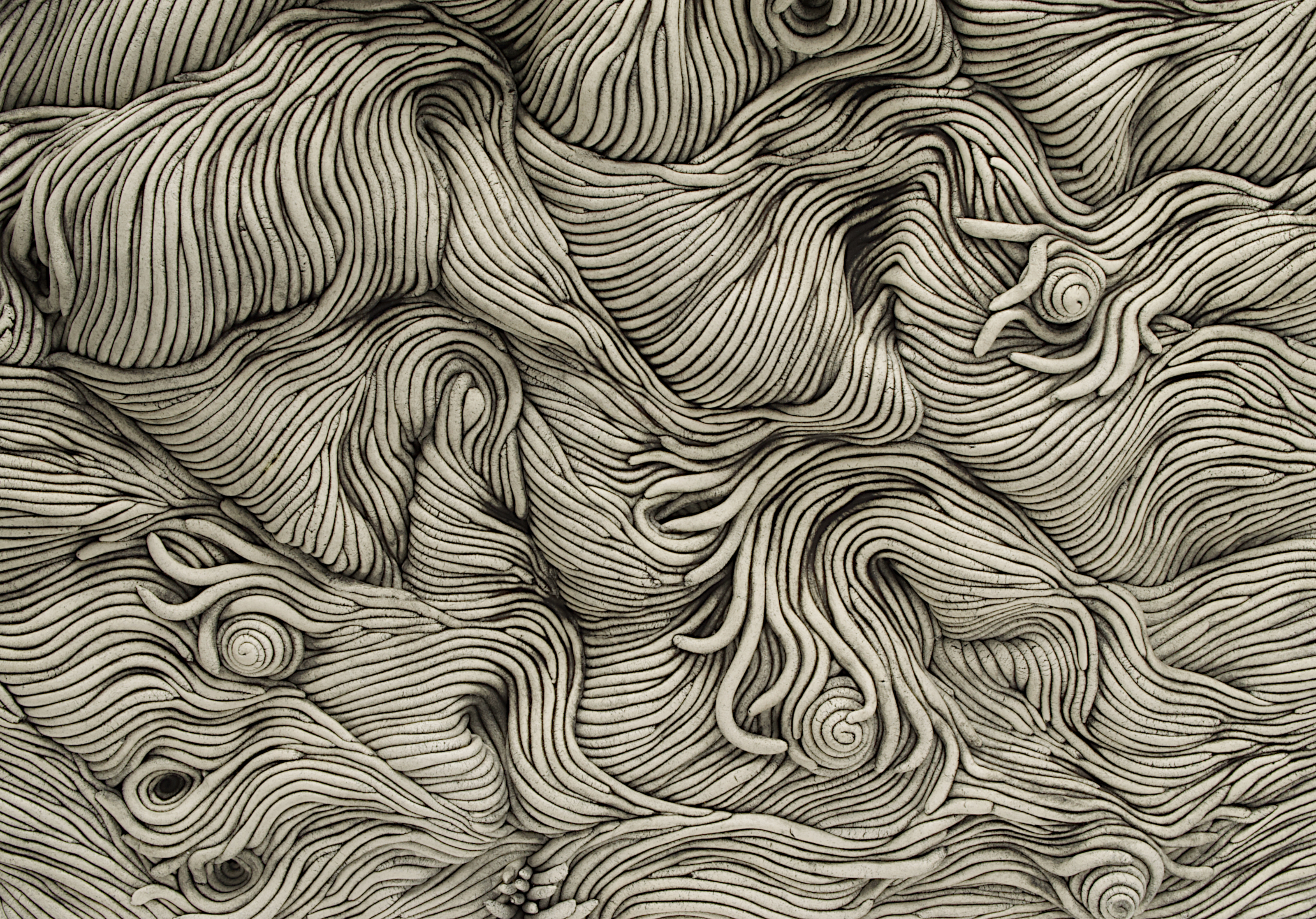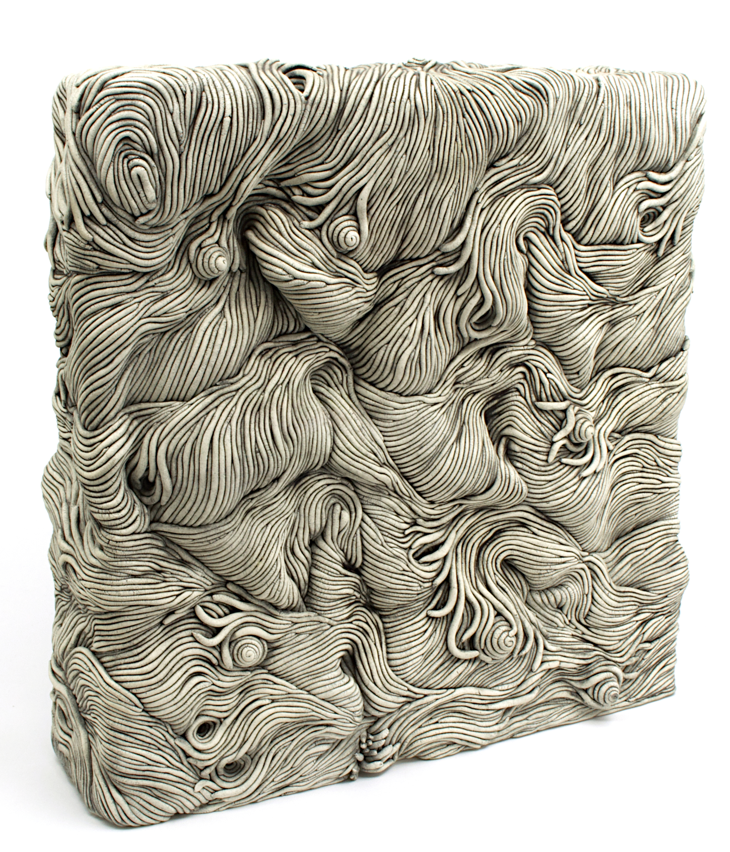 After taking a break from my square series, I returned with this one after two years. Sometimes putting certain constraints on oneself can reveal the true depth of a subject. More of these are in the works. Writer Kathryn Davis says these remind her of blocks of ramen noodles. I just think they’re really cool looking and help me get over my perhaps irrational, distaste for square shapes. Each coil rolled by hand, one at a time, stacked and tapped into place. A black mason stain wash is applied as a simple treatment to bring out the complexity of the texture. Works in my “Square” series are never perfectly square. I do my best and go by eye for level. This one is close, but has a slight bend when viewed from the top which reveals the artist’s hand in the work. This work has never been shown in a gallery setting. I intended to keep it myself but have decided I can make more. Free delivery included to U.S. locations.